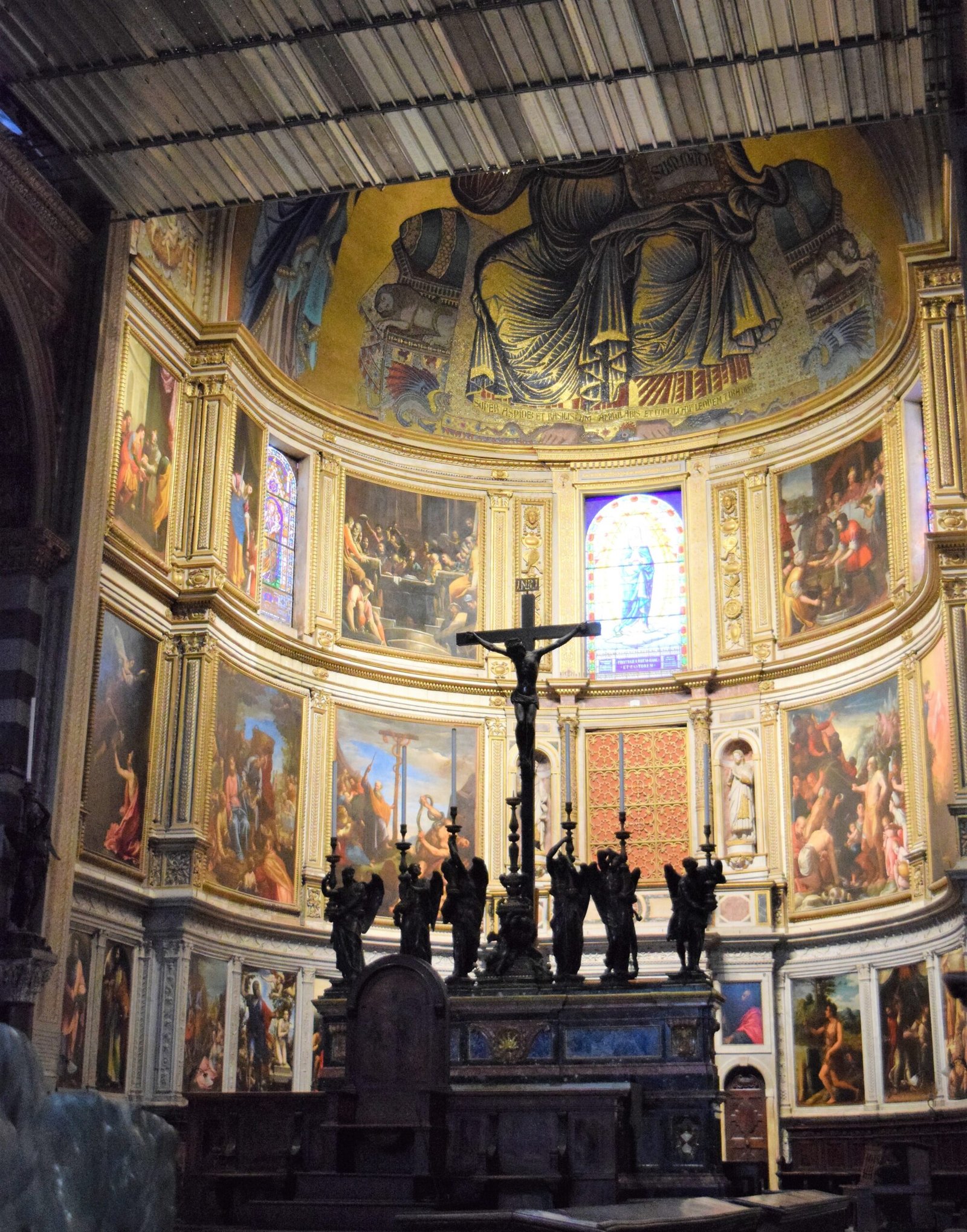 As luck would have it on our last trip they were restoring the main altar and part of one of the sides. It was deceiving at first because the screen print actually looks like the fresco but we saw lights through the material. That gave it away! They really did a good job at keeping the scaffolding minimal so you could still admire the surroundings. Time to go back and take another photo!