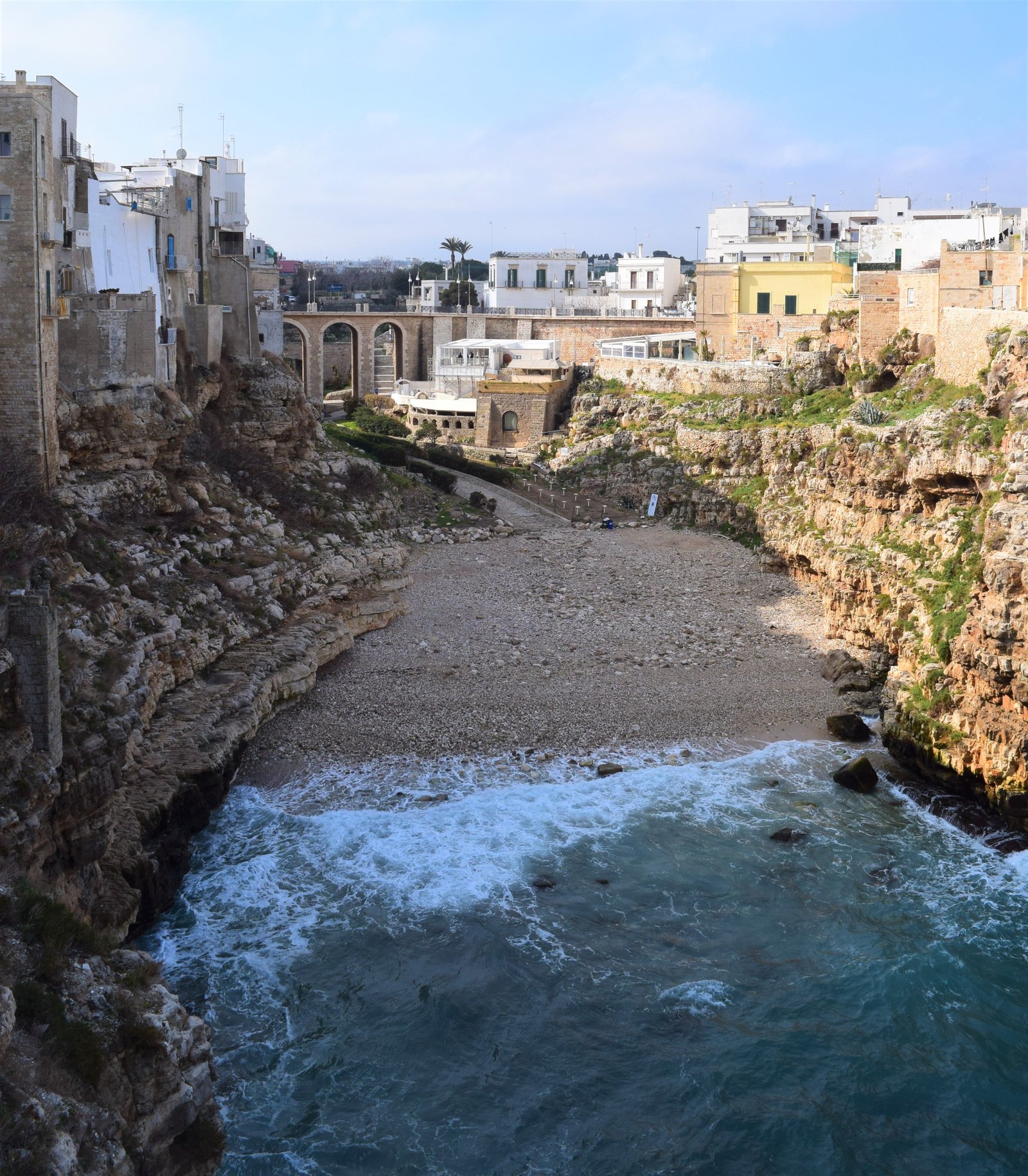 Our first visit to Polignano a Mare was on March 22nd. The photos in this post are from that day except for the one below. We took the bus for a second visit on April 20th and look at the crowds below! The street over the bridge was even closed to traffic. If you can travel other than high season, I strongly urge you to do so. What a difference!